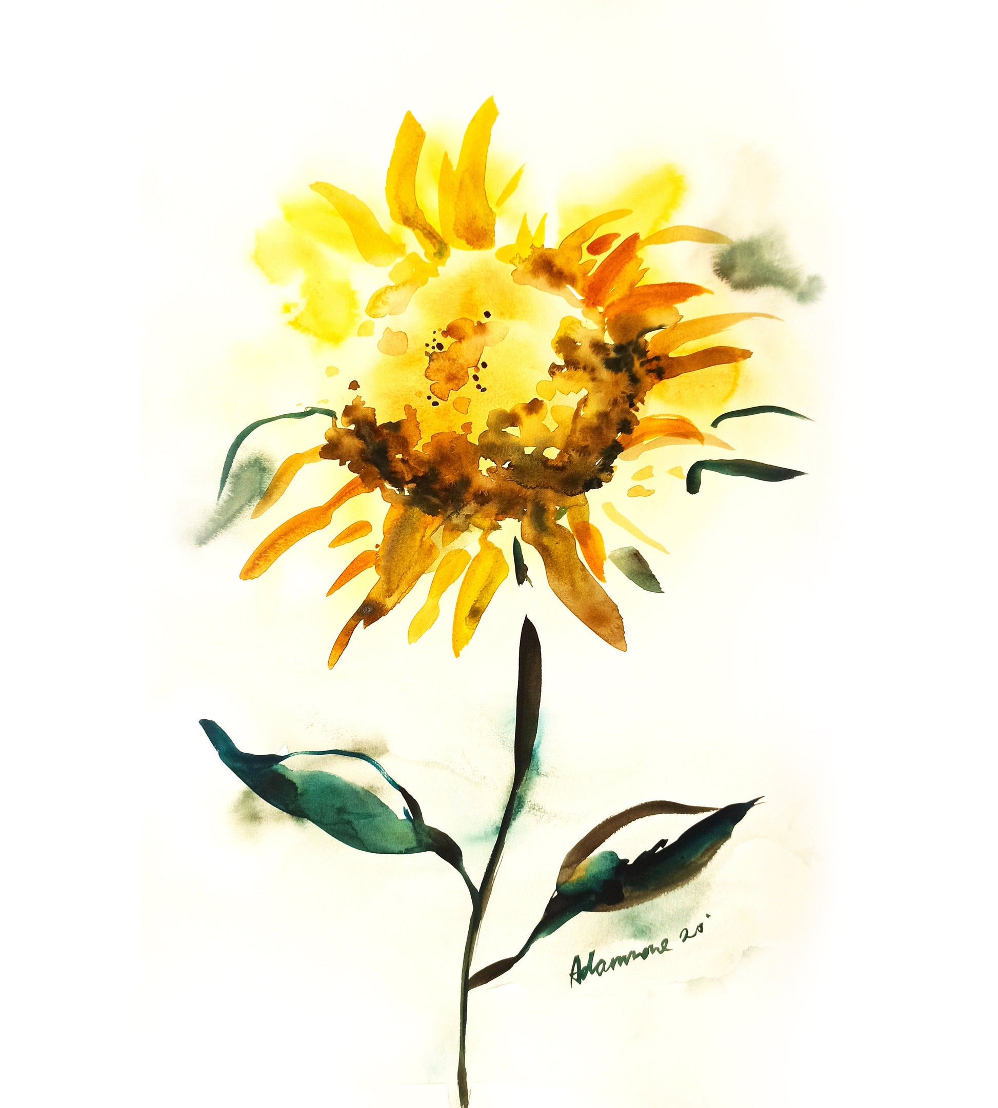 This abstract sunflower painting is an original watercolor art by Alisa Adamsone. It will make a unique wall art for a hotel room or floral wall decor for home. Unique Gift for wedding, for birthday. Contemporary watercolor drawing, illustration. Watercolour flower picture. Mother's day gift